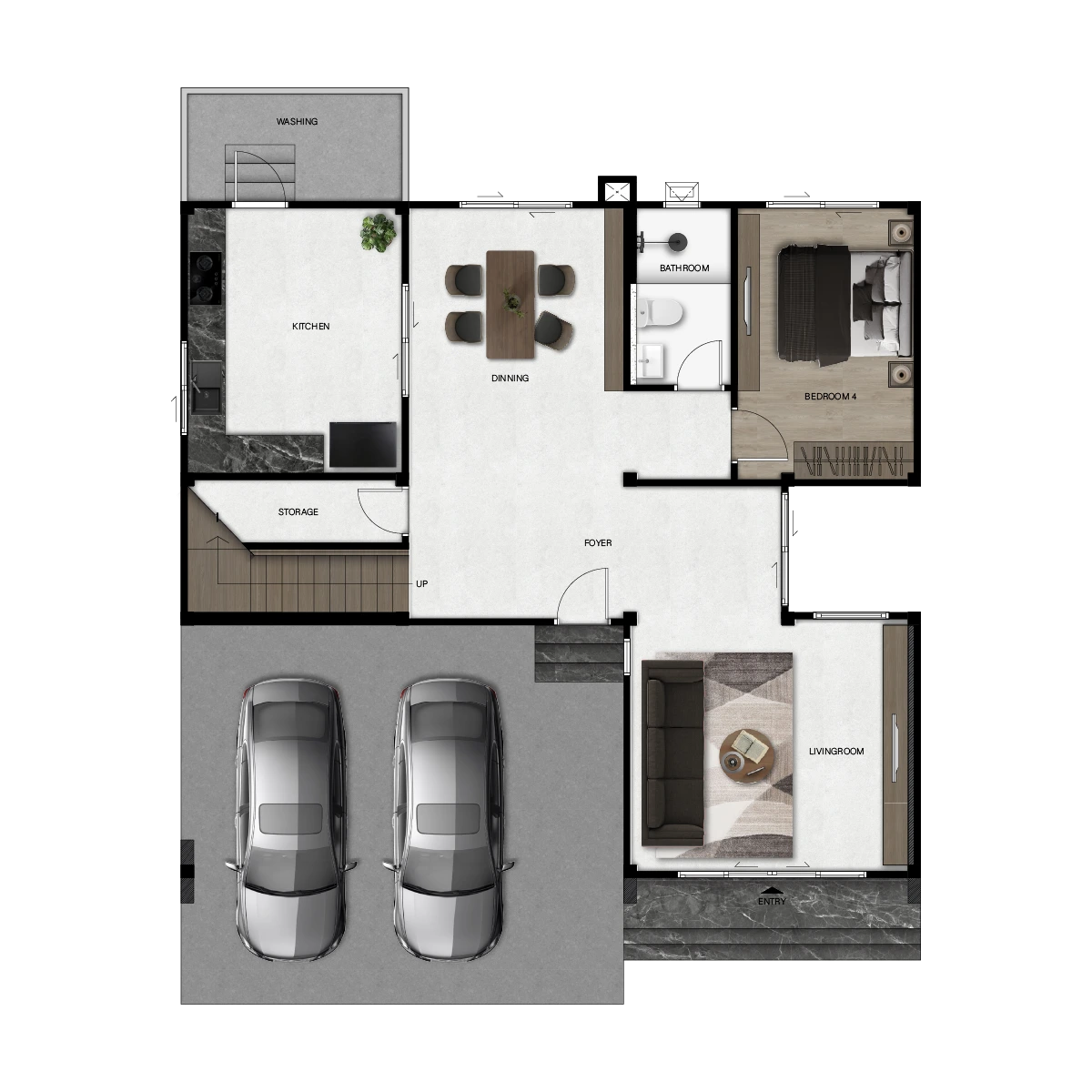 - ผังใช้สอย 4 ห้องนอน 4 ห้องน้ำ 1 ห้องครัว 1 ห้องนั่งเล่น 1 ห้องอาหาร 2 ที่จอดรถ พร้อมโถง Double Volume